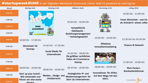 Vom 24.09. bis zum 28.09.2018 findet die diesjährige startupweek:RUHR statt. Die startupweek:RUHR ist die dezentralen Eventreihe von und für alle Mitglieder der digitalen (Start-up)Szene im Ruhrgebiet. Von Workshops, Impulsvorträgen und Meetups bis hin zu Pitches, Messen und Networking-Veranstaltungen, die Startups und Gründungsinteressierten erleben die facettenreiche Start-up-Szene des Ruhrgebiets in einer Woche.