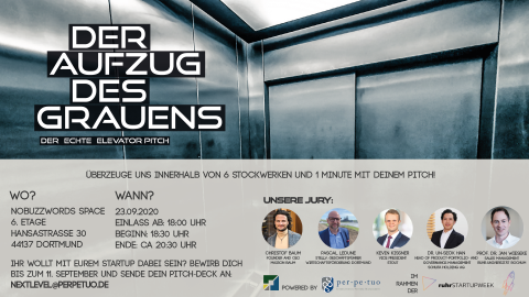 Im Rahmen der diesjährigen startupweek:RUHR veranstaltet die perpetuo GmbH, am Mittwoch, 23.09.2020, eine einzigartige Pitch-Competition der etwas anderen Art: Der Aufzug des Grauens – der echte Elevator Pitch!